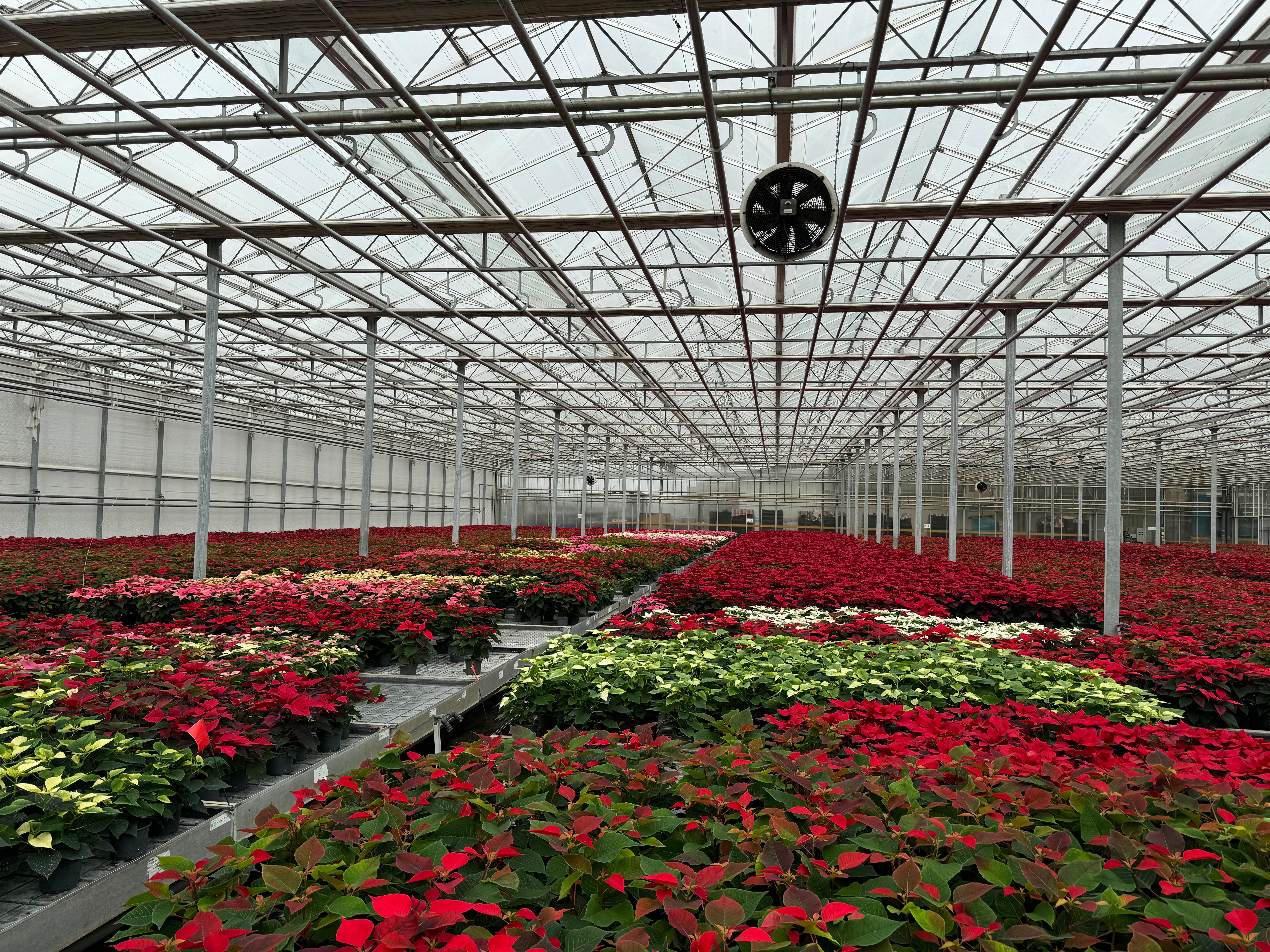 Ideal greenhouse conditions, maintained at 24°C to 26°C, are achieved through automated venting and a biomass woodchip boiler. These practices allow the poinsettias to thrive naturally, eliminating the need for blacking out plants to force blooming.