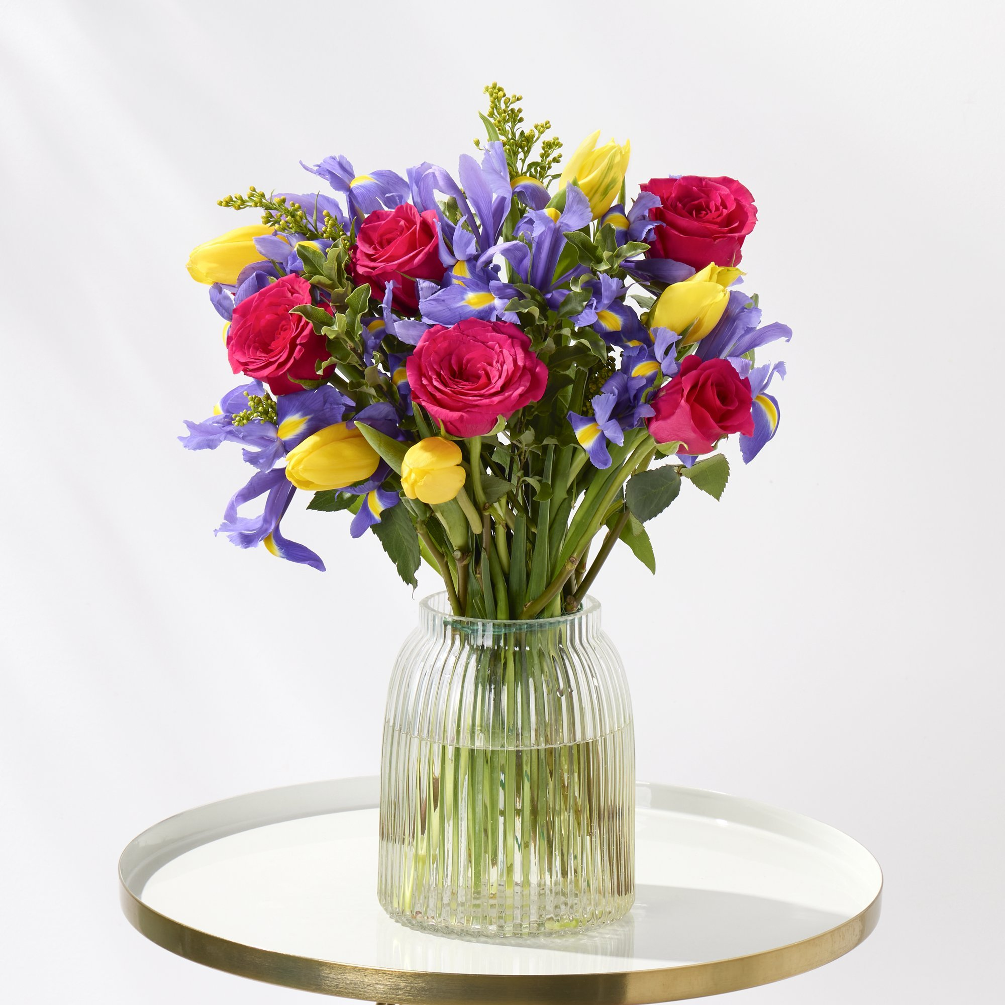 6 blue iris, 5 cerise roses, 5 yellow tulips, 2 solidago and 2 mini pittosporum